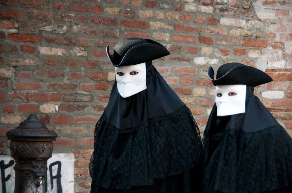 Tra le mascherine più diffuse a Venezia spiccava quella di Baùta, caratterizzata da una “larva” bianca sotto un tricorno nero ed un mantello scuro, il tabarro.