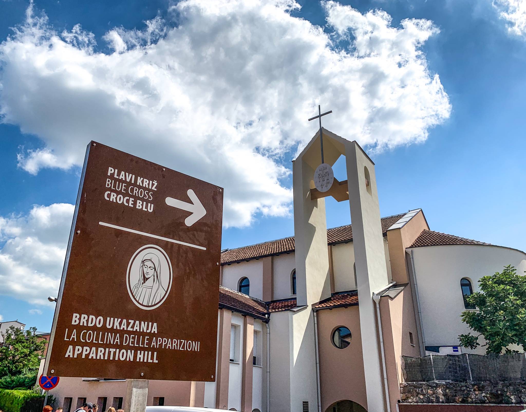 Per giungere in cima alla collina, i pellegrini devono percorrere un ripido sentiero caratterizzato da terreno scosceso e pietre enormi, intervallato da rilievi in bronzo che rappresentano i misteri gioiosi e dolorosi del rosario. Al lato di questo percorso si trova una grande croce in legno che segna il luogo in cui la Vergine Maria è apparsa a Marija Pavlovic invitando, per la prima volta, il mondo alla pace.