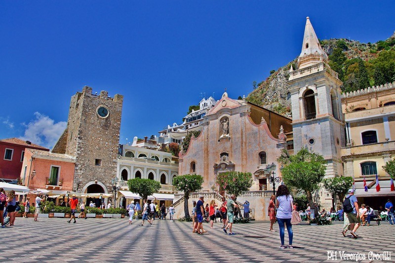 Le distanze sono molto brevi, per cui il consiglio è di godervi Taormina in ogni suo angolo, non tralasciando alcuno scorcio! Continuando per il Corso Umberto I giungerete poi alla Piazza IX Aprile, la “terrazza” da cui è possibile osservare un magico panorama su tutta la fascia ionica. Qui si affacciano la Chiesa di San Giuseppe, con alle spalle la Chiesa di Taormina, la Chiesa di Sant’Agostino e il Castello con la famosa Torre dell’Orologio.